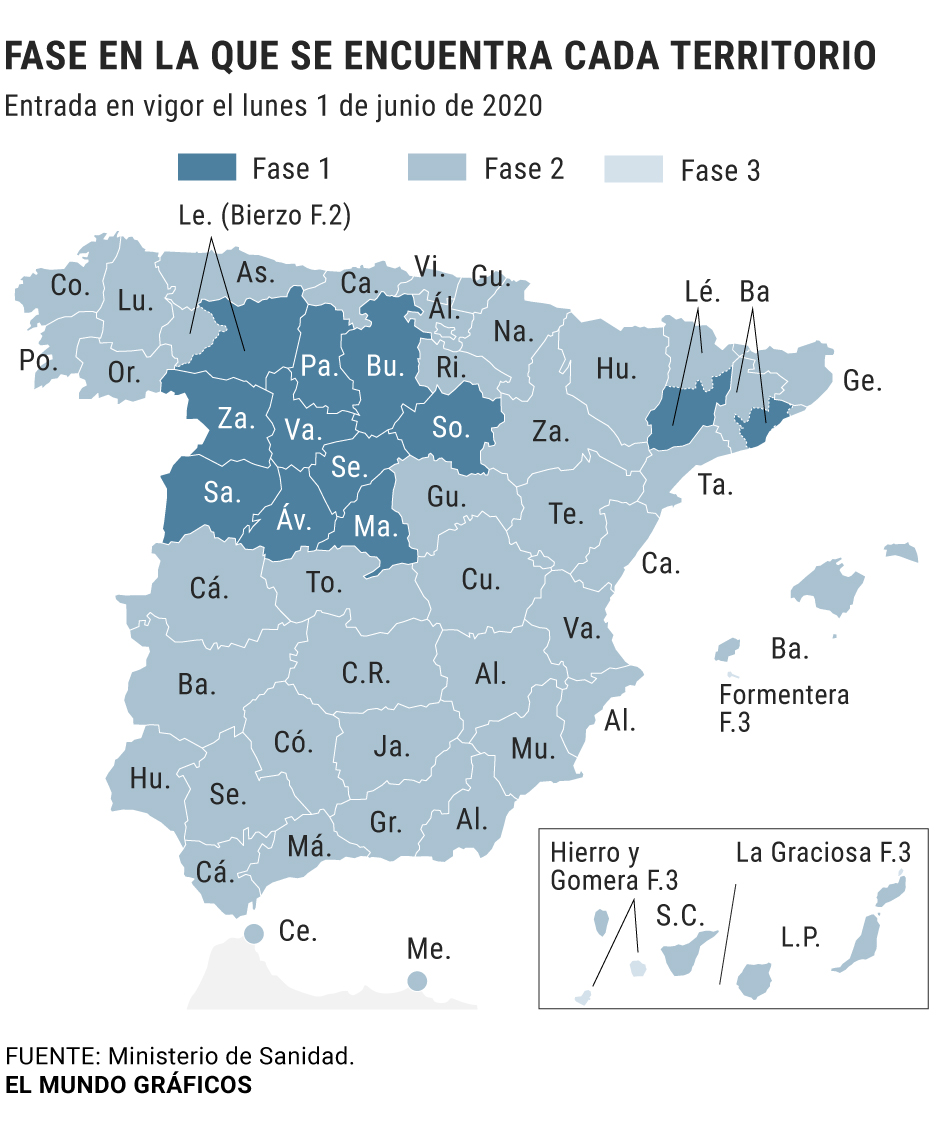 Espaa contina avanzando en la desescalada y un 70% de la poblacin del pas se encontrar el lunes en la Fase 2. El Ministerio de Sanidad ha anunciado este jueves que estn listas para subir este peldao toda la Comunidad Valenciana, las provincias descolgadas de Andaluca (Mlaga y Granada) y de Castilla-La Mancha (Toledo, Ciudad Real y Albacete), as como algunas regiones sanitarias de Catalua y el rea sanitaria de El Bierzo en Castilla y Len. Mientras tanto, las islas de La Gomera, El Hierro y La Graciosa (Canarias) y Formentera (Baleares) son la avanzadilla y sus 45.000 habitantes sern los pioneros en acceder a la Fase 3.