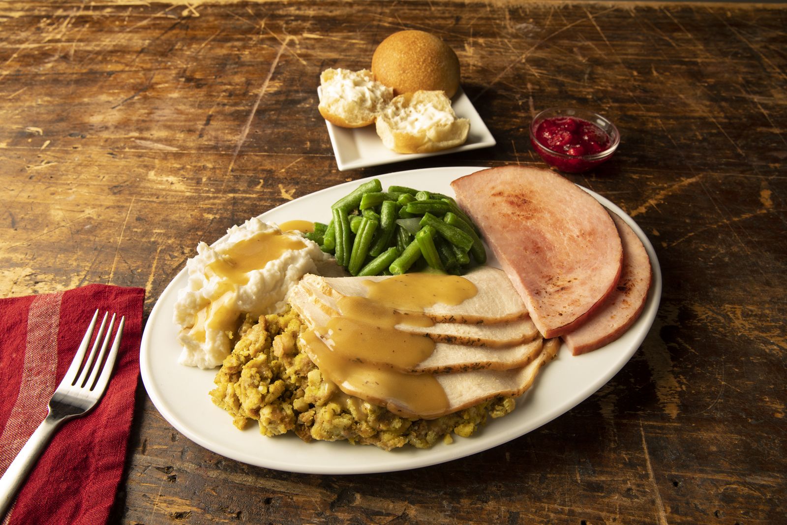 Le Premium Farmhouse Feast sert 8 à 10 personnes et comprend de la dinde rôtie lentement et du jambon fumé à l’hickory, ainsi que des plats d’accompagnement frais de la ferme comme la vinaigrette au pain et au céleri, la purée de pommes de terre avec sauce, les haricots verts au jambon, les macaroni au fromage, les canneberges relish, petits pains frais, pain aux bananes et tartes aux cerises et aux pommes, pour 129,99 $. Les fêtes de la ferme sont disponibles pour les petits groupes de quatre et huit à partir de 59,99 $.