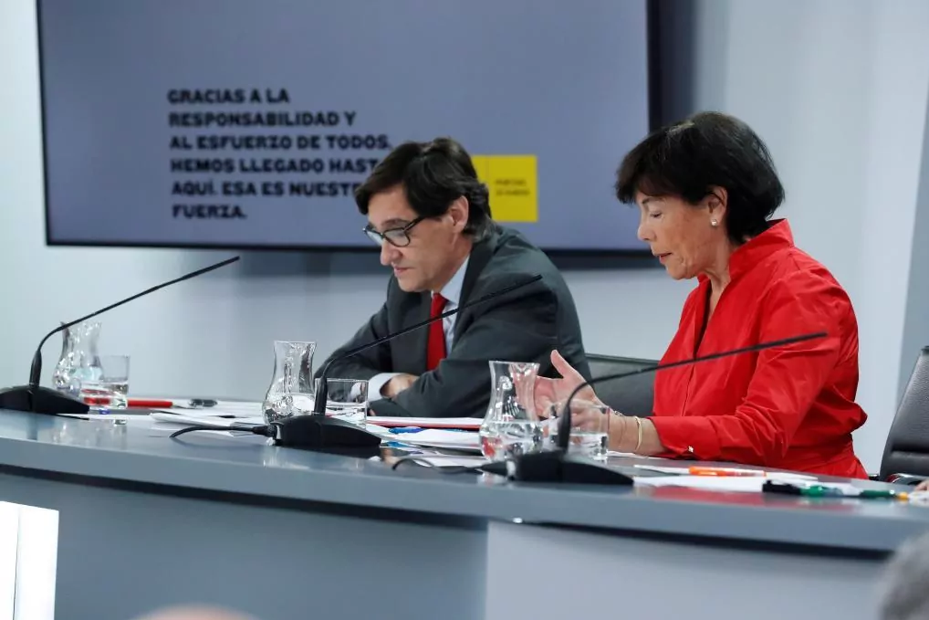 Les ministres de la santé, Salvador Illa; et Education, Isabel Cela, lors d'une conférence de presse pour présenter les mesures.