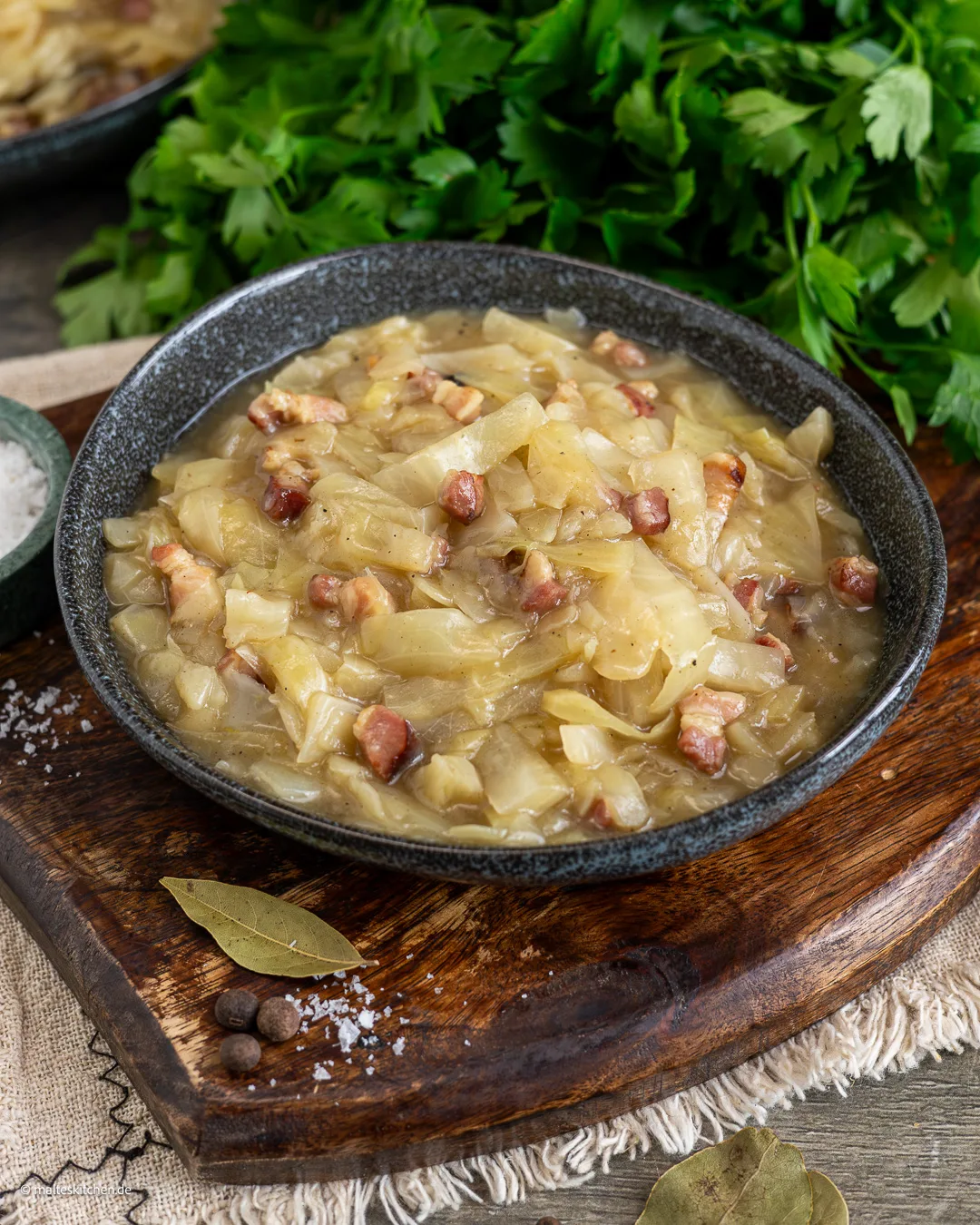 Je connais le Kraut bavarois comme accompagnement d'un rôti de porc, d'un rôti de porc ou de côtelettes de porc. Mais il accompagne aussi à merveille le bœuf braisé. Le Kraut bavarois se compose de chou blanc braisé jusqu'à ce qu'il soit tendre et finit par avoir une consistance « pâteuse ». C'est exactement cette consistance juteuse qui rend ce plat d'accompagnement si bon pour moi. J'obtiens cette feuilleté avec de la fécule de maïs. Grand-mère utilisait aussi de la graisse de porc pour cela.