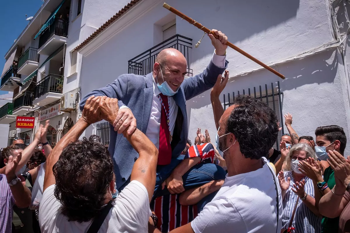 Le socialiste Alexis Landero célèbre sur les épaules de ses voisins ayant obtenu le maire de Cartaya.