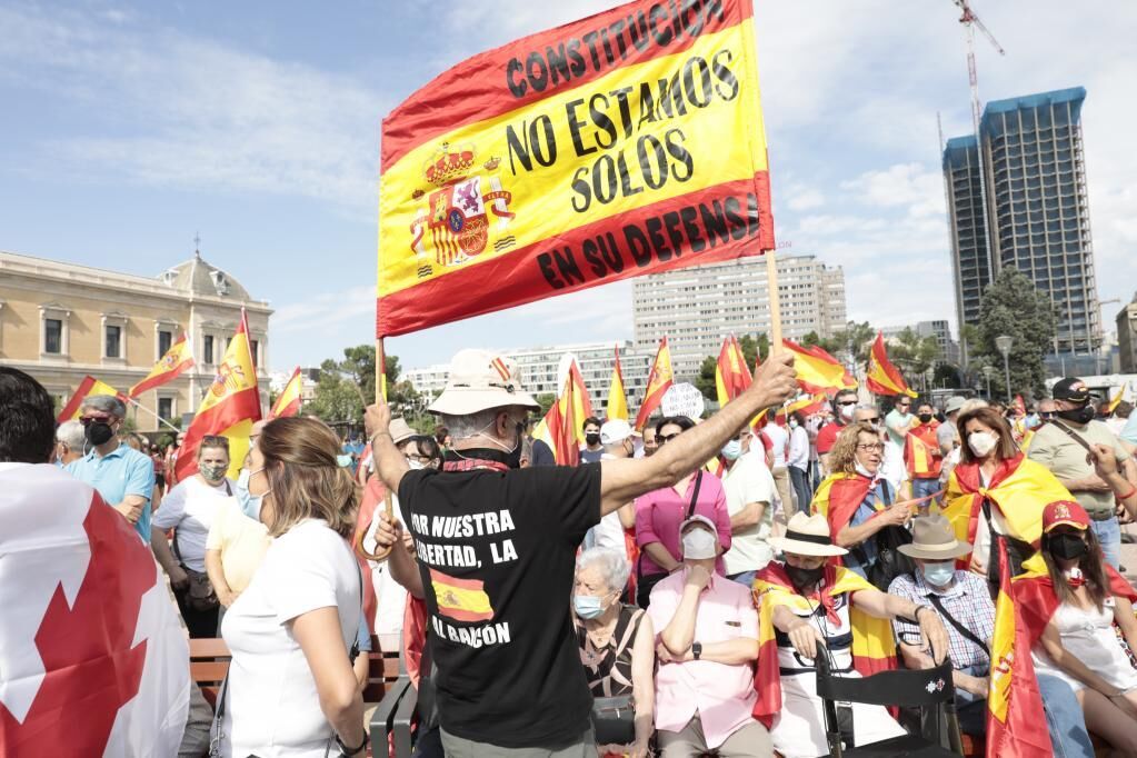 Les citoyens portent des drapeaux espagnols et beaucoup se couvrent la tête du soleil ce dimanche de juin avec des chapeaux. Il ne manque pas non plus de masques dans une concentration autorisée par la Santé où les recommandations contre le coronavirus passent par le maintien de la distance de sécurité et l’utilisation de cette protection individuelle.
