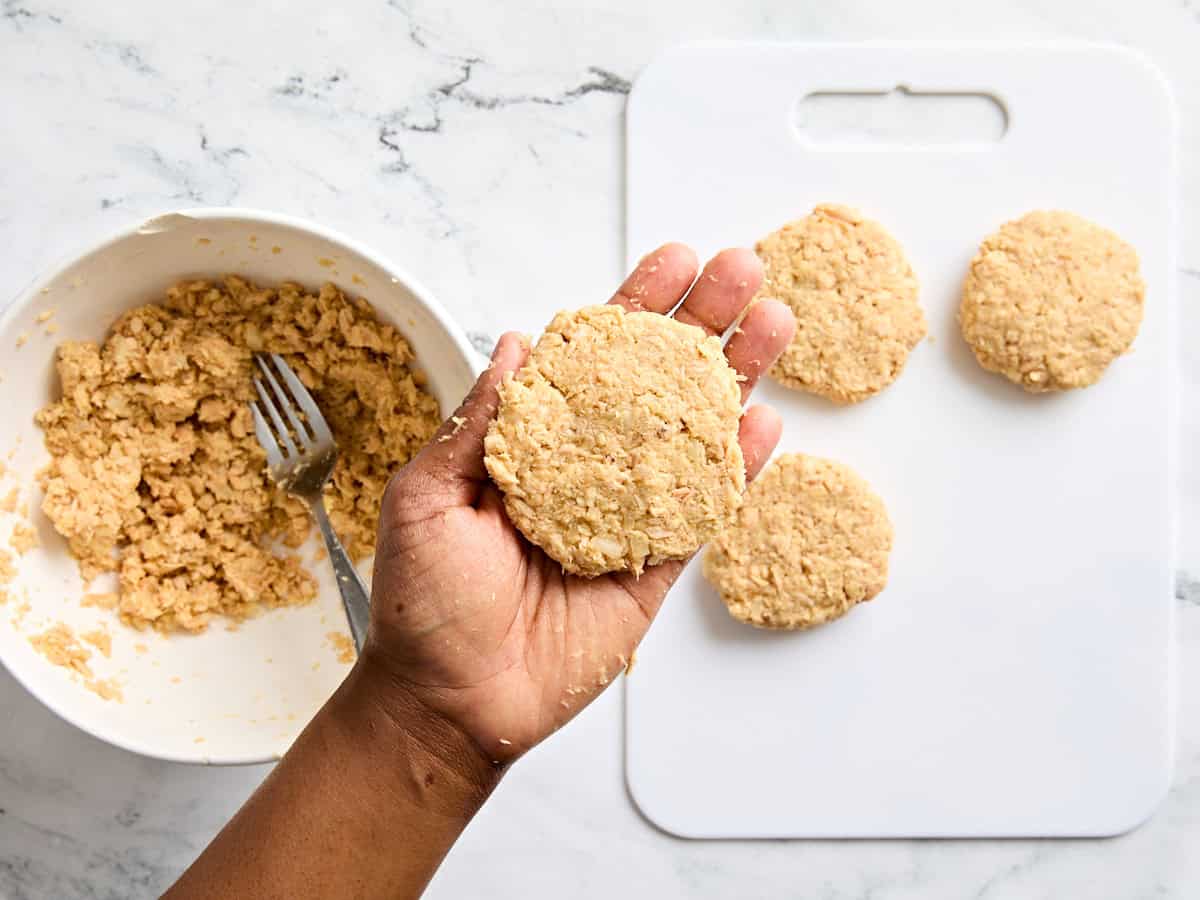 Façonner les galettes: Utilisez 3-4 cuillères à soupe du mélange de saumon pour faire chaque galette. Utilisez vos mains pour former et façonner le mélange dans des galettes égales et égales. Je reçois généralement 6-7 galettes chaque fois que je fais cette recette. Placer chacun sur le côté jusqu'à ce que tout le mélange soit utilisé.