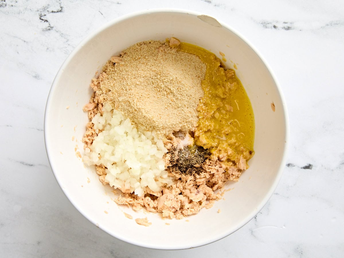 Combinez les ingrédients: Placer le saumon drainé dans un grand bol à mélanger avec ¼ tasse d'oignon finement coupé en dés, ¼ c. À thé de sel, ¼ cuillère à café de poivre noir fraîchement fissuré, 1 grand œuf légèrement battu, 5 cuillères à soupe de chapelure nature et 1 cuillère à soupe de jus de citron.