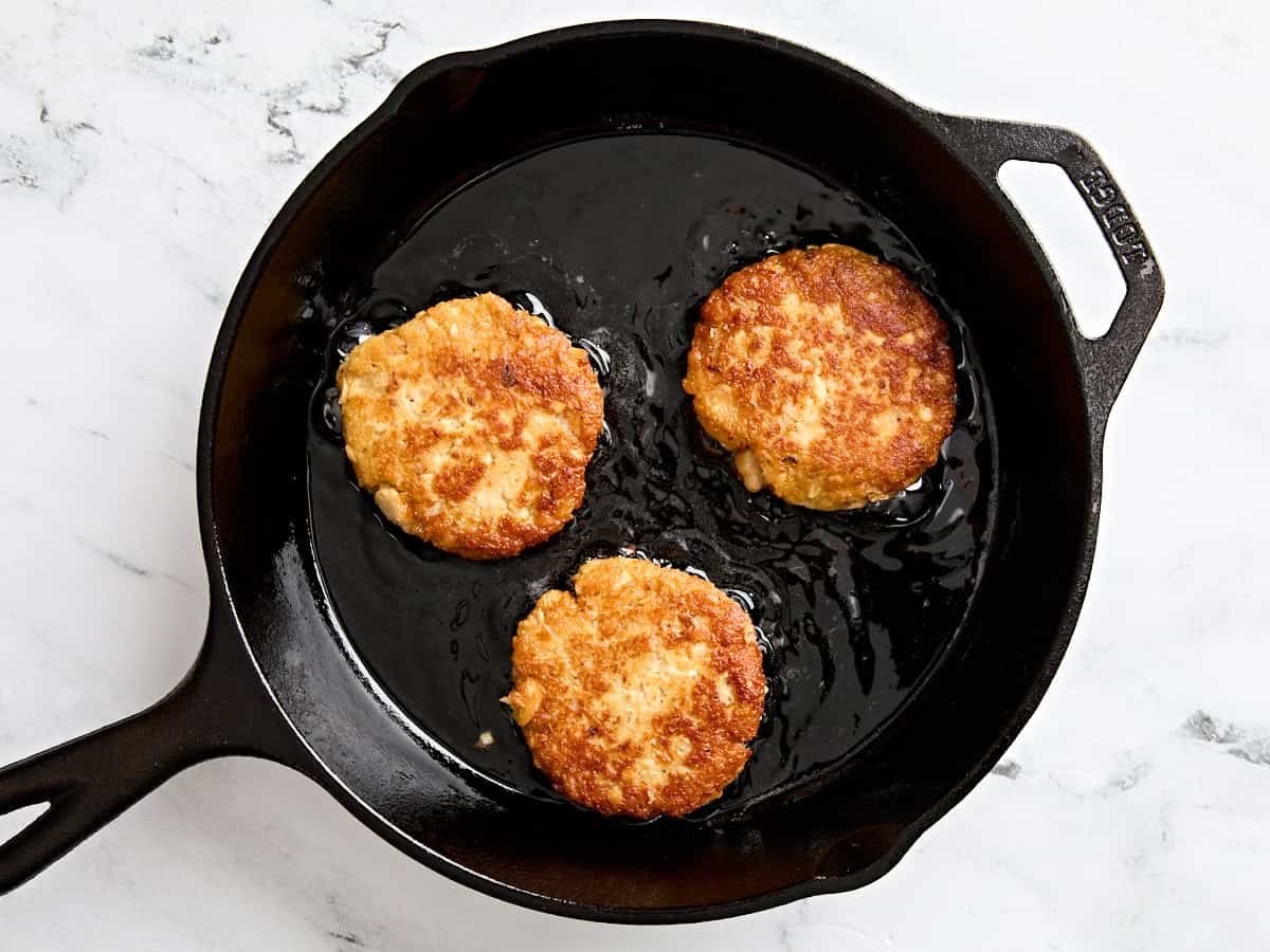 Chauffer l'huile de cuisson dans une poêle en fonte à feu moyen. ** Une fois l'huile chaude, ajoutez les galettes à la poêle et faites cuire en 2 lots. Cuire les galettes pendant environ 3 minutes de chaque côté jusqu'à ce qu'elles soient brun dorées. *** Retournez doucement les galettes lors de la cuisson du deuxième côté pour les empêcher de se séparer.