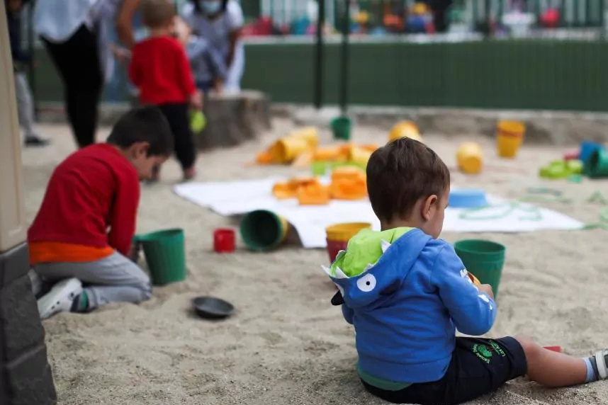 Certains enfants jouent séparément dans une crèche à Madrid.