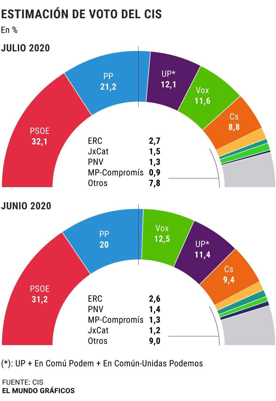 Au contraire, le mouvement d'indépendance catalan -ERC et JxCAT- connaîtrait de légères augmentations, plus importantes pour les seconds que pour les premiers. Les républicains gagneraient un dixième de la prévision de juin, se situant maintenant à une intention de vote de 2,7%, tandis que Junts gagnerait trois dixièmes pour atteindre 1,5%. Cependant, les deux forces seront loin du niveau de 10-N lorsqu'elles auront obtenu respectivement 3,6 et 2,2% des suffrages.