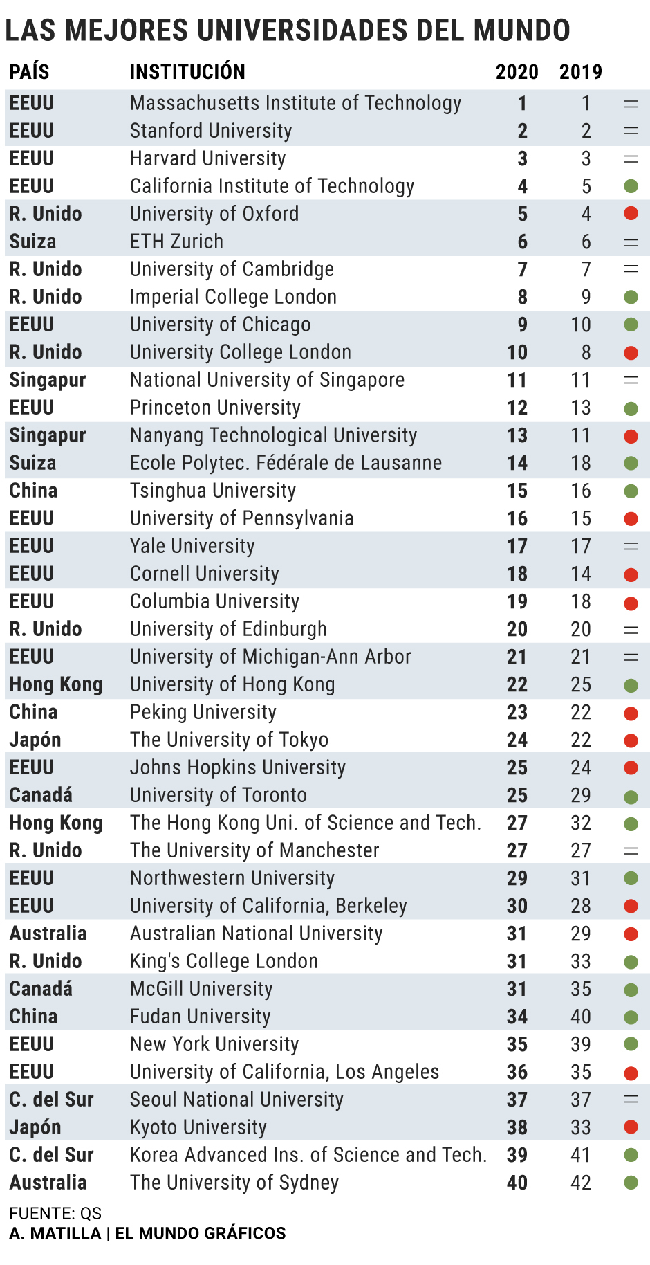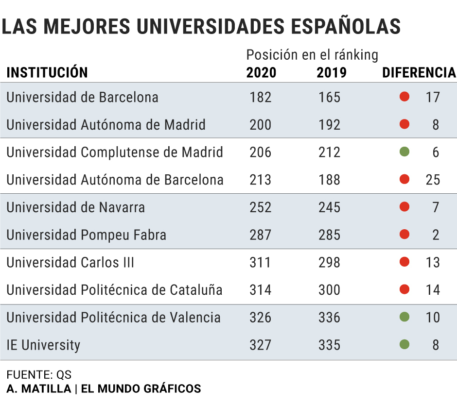 El QS, una de las tres clasificaciones ms prestigiosas, sita a 26 universidades espaolas en una lista de 1.000. Pero 18 de estas 26 ha perdido posiciones este ao, segn advierte Ben Sowter, vicepresidente de QS.Esta tendencia no se da en los mejores campus del mundo, que siguen estables. Por qu en Espaa s?