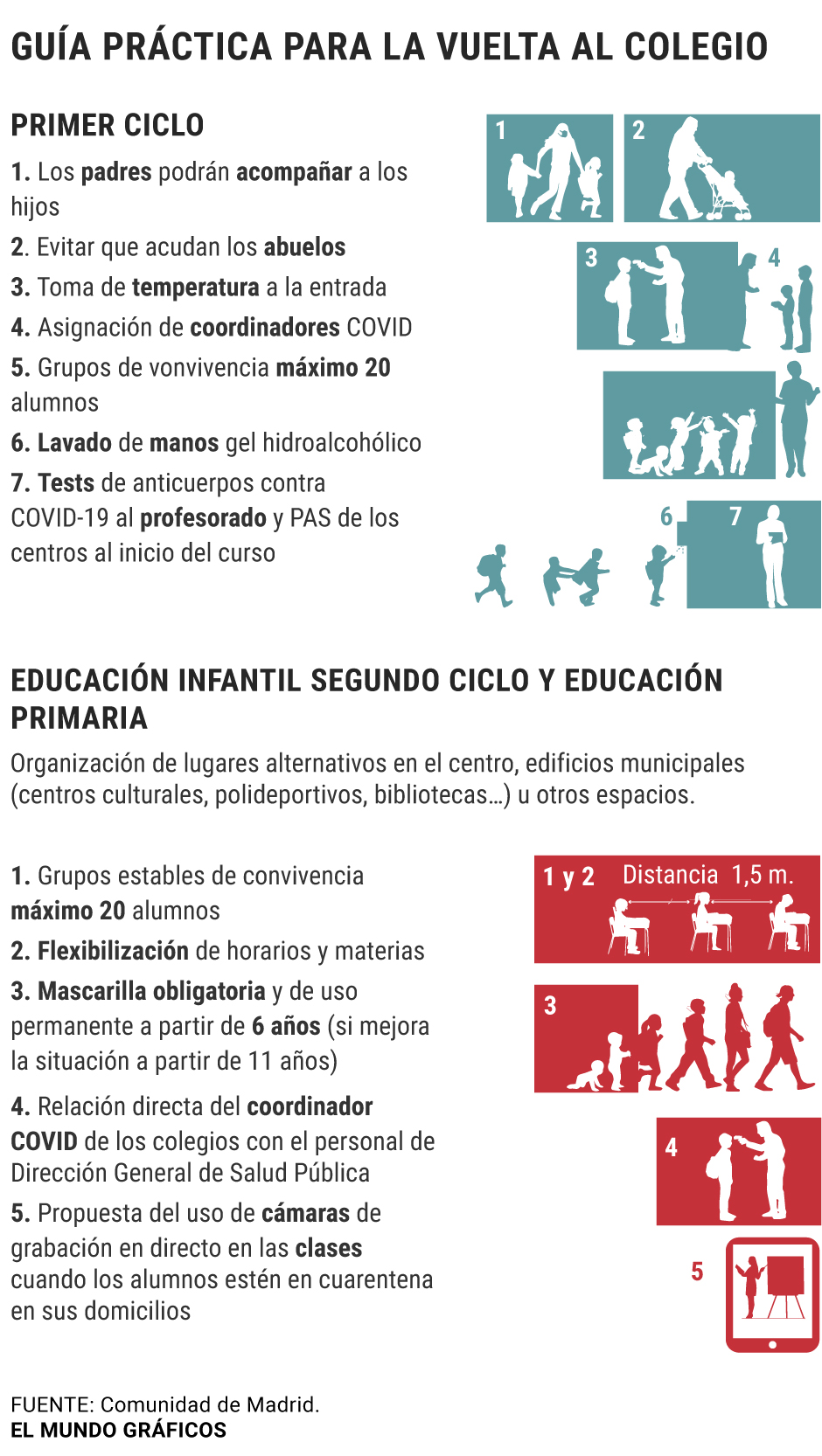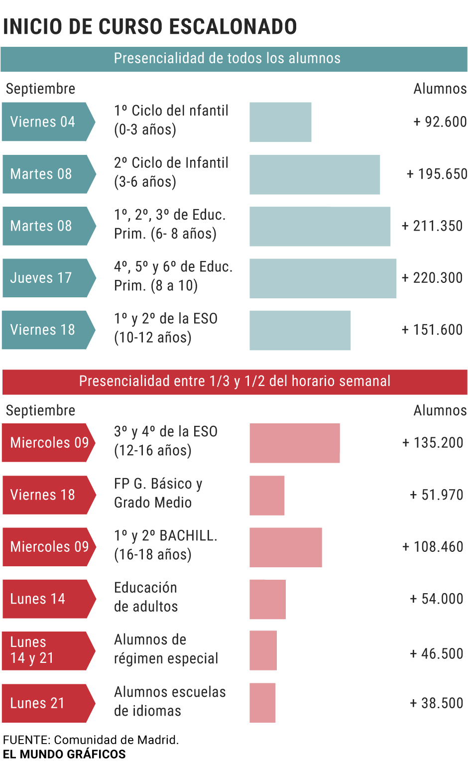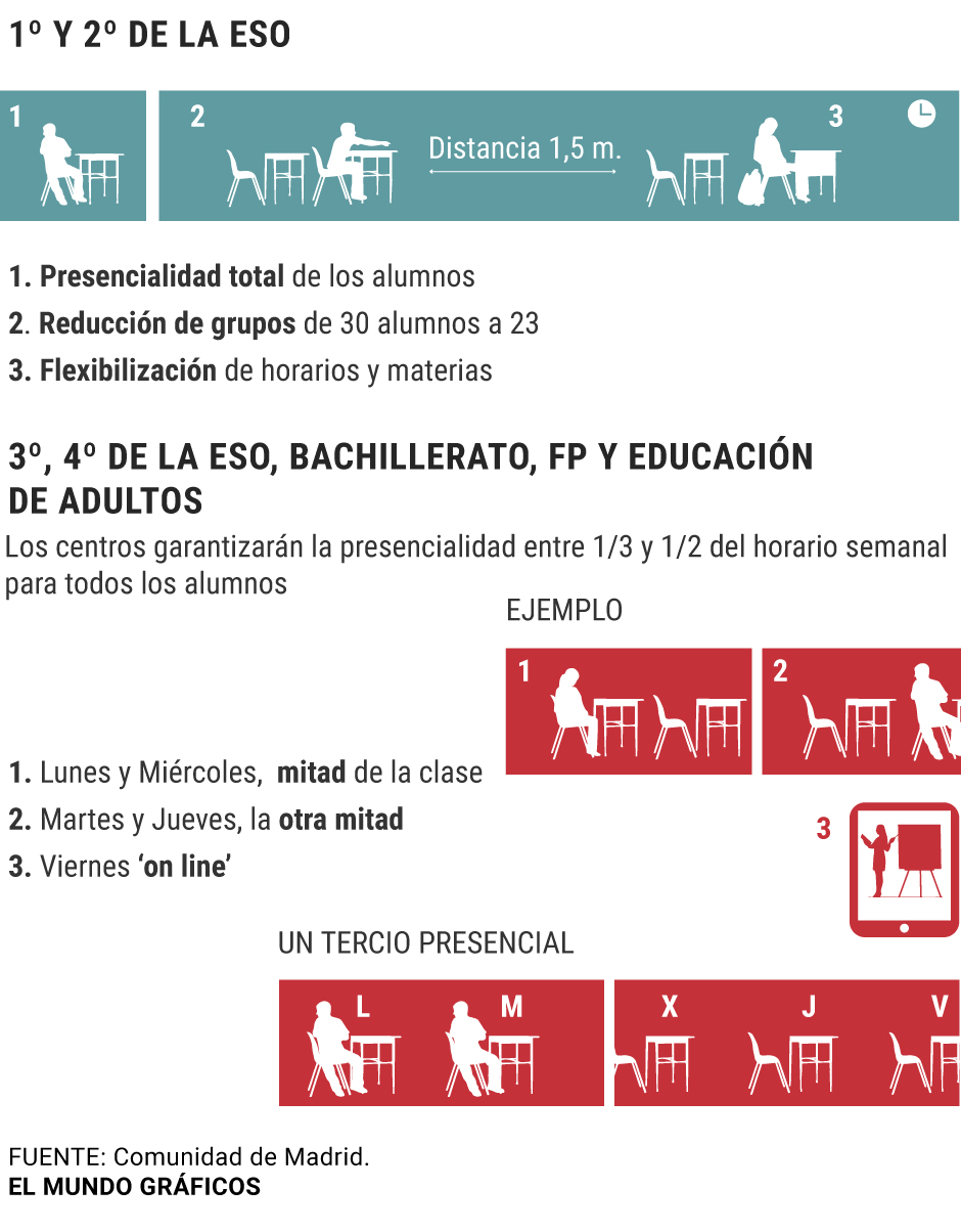 L'année scolaire dans la Communauté de Madrid commence par les cours face-à-face chez les nourrissons, les primaires et les secondaires 1 et 2 et se fondre dans le reste des niveaux. De plus, le nombre d'étudiants par classe est limité à 20 et 23 étudiants – lorsque les ratios permettent jusqu'à 25 et 30 selon le niveau d'enseignement – et environ 11 000 professionnels seront embauchés, principalement des professeurs et des enseignants.