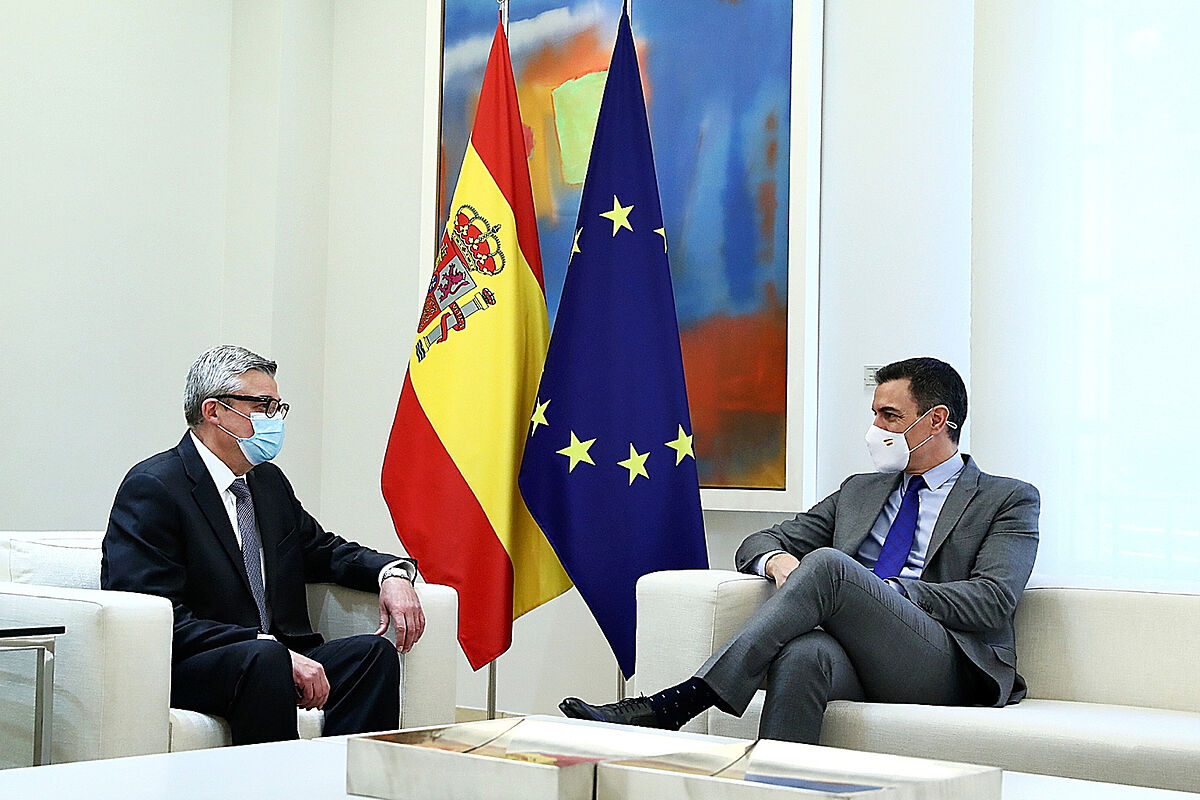 Le président du gouvernement, Pedro Sánchez, lors de sa rencontre hier avec l’ambassadeur d’Ukraine en Espagne, Serhii Pohoreltsev.bassin