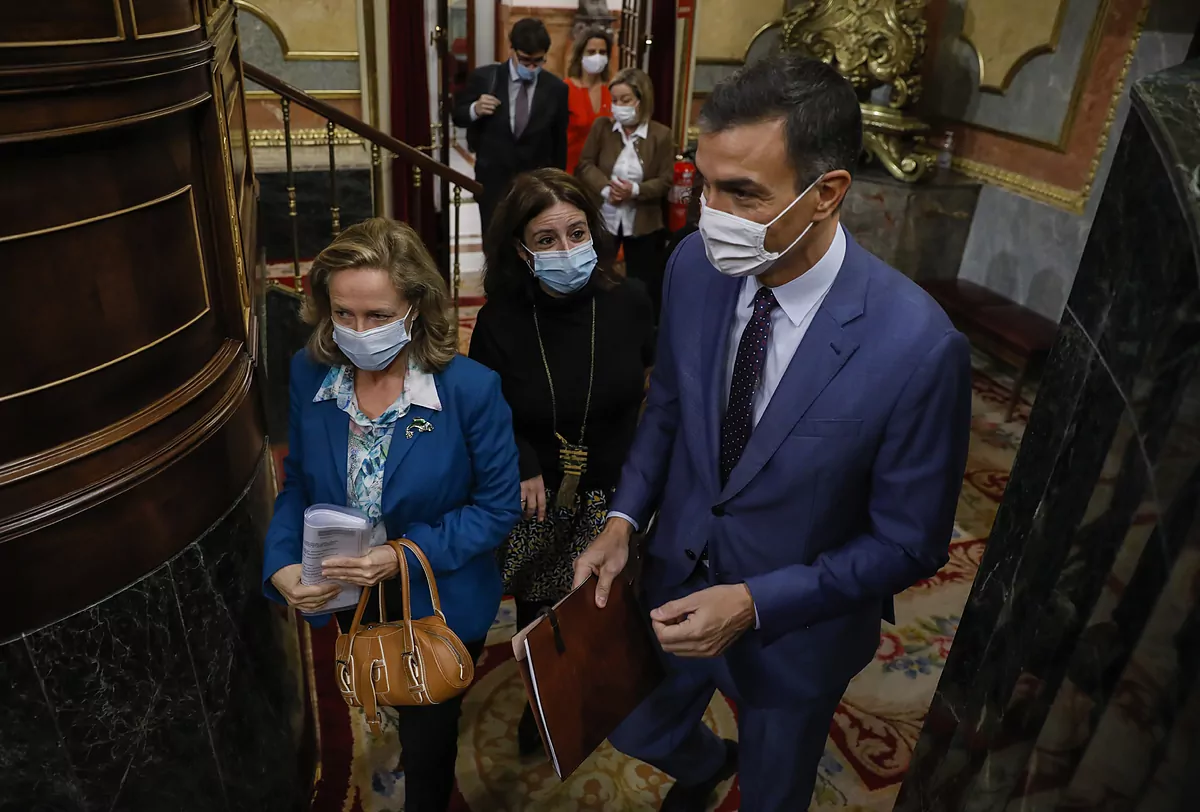 Le président du gouvernement, Pedro Snchez, avec Adriana Lastra et la ministre de l'économie, Nadia Calvio, lors de la séance de contrôle au gouvernement la semaine dernière.