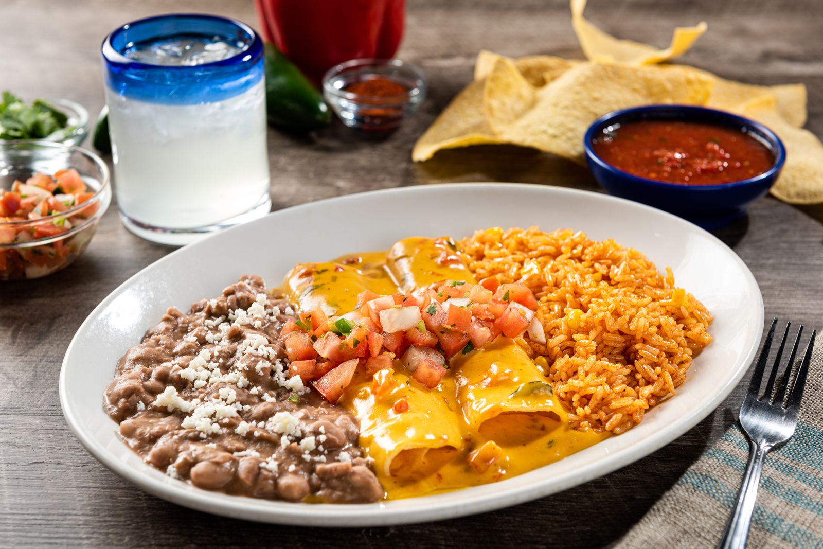 - Enchiladas au fromage Queso – Deux enchiladas au fromage garnies du queso et du pico de gallo signature d’On The Border, servis avec riz mexicain et choix de haricots.