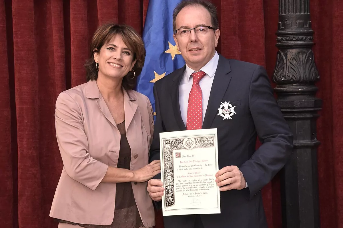 Jos Luis Rodrguez lvarez et Dolores Delgado, actuel procureur général de l'État, avec la croix d'honneur de l'ordre de San Raimundo de Peafort, en juin 2019.