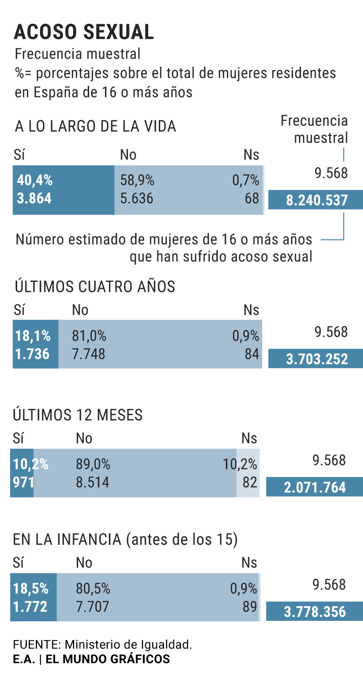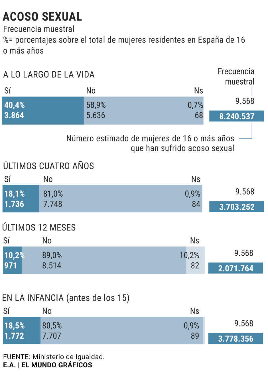 Plus précisément, la ventilation des données montre que 21,5% des femmes ont subi des violences physiques tout au long de leur vie (4 387 480 femmes); 13,7% ont été victimes de violences sexuelles (2 802 914 femmes) et 40,4% ont déclaré avoir été victimes de harcèlement sexuel (8 240 537 femmes). Cette dernière section est celle qui présente le volume le plus élevé, avec des données telles que trois femmes sur quatre de plus de 16 ans (75,2%) affirment que le harcèlement sexuel s'est produit plus d'une fois.