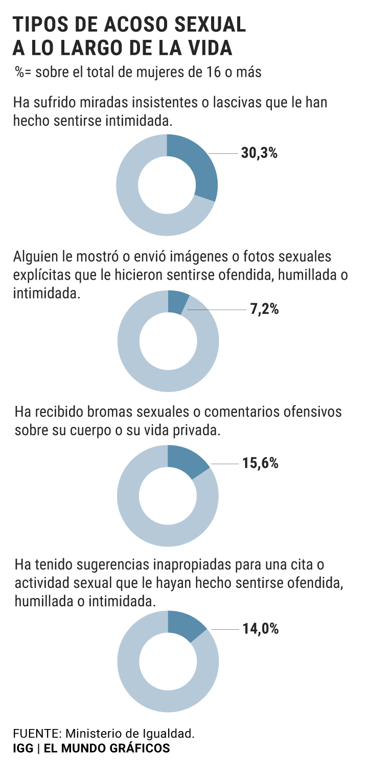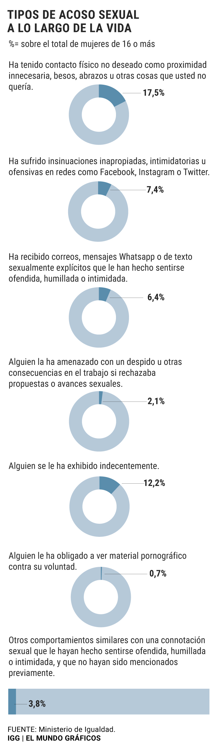 Le ministère de l'Égalité, lors de l'établissement de la méthodologie de ce rapport, inclut dans la catégorie du harcèlement sexuel "une série de comportements non désirés à connotation sexuelle" tels que des regards insistants ou lascifs; contact physique indésirable; exhibitionnisme; Envoi d'images ou de photos sexuellement explicites qui ont rendu la femme offensée, humiliée ou intimidée; plaisanteries sexuelles ou commentaires offensants sur votre corps ou votre vie privée; Avances inappropriées, humiliantes, intimidantes ou offensantes sur les réseaux sociaux; ou des courriels inappropriés, sexuellement explicites, des messages WhatsApp ou des messages texte qui vous ont fait vous sentir offensé, humilié ou intimidé, entre autres.