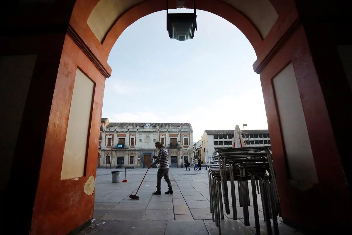 Un ouvrier de l’hôtellerie vient chercher la terrasse de son bar, à Cordoue.