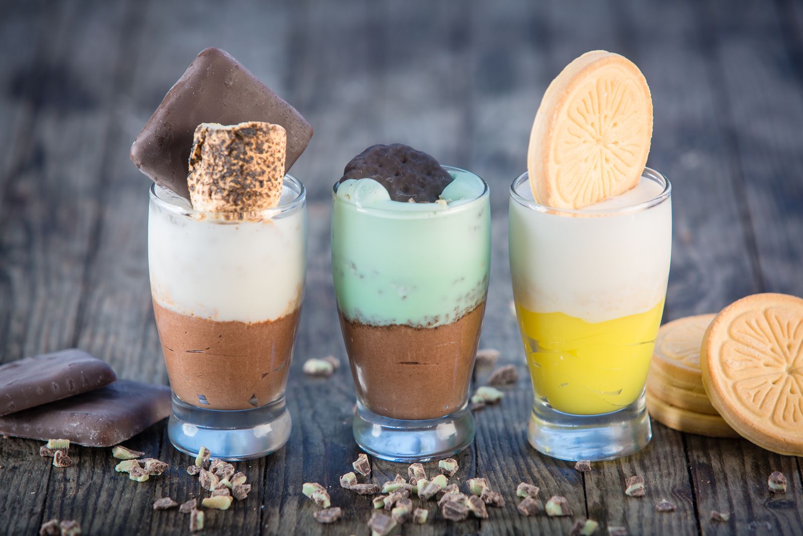 - Menthe mince commence par une base de mousse au chocolat, des menthes fines émiettées, de la glace à la menthe et aux pépites de chocolat et est garnie de menthes andes et d’un ensemble