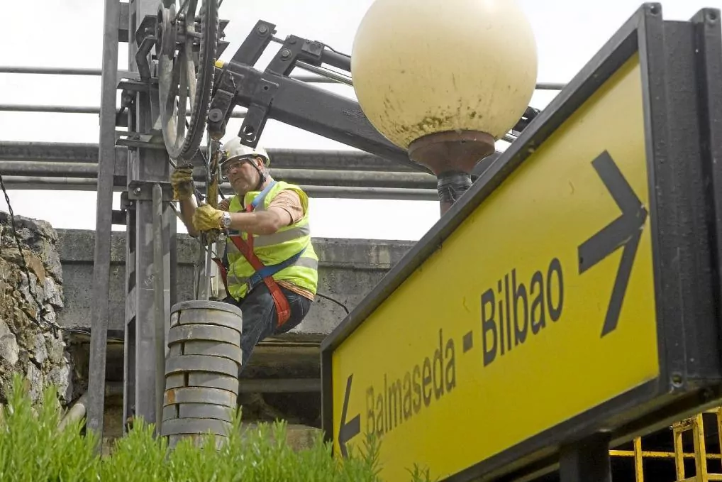 Deux ouvriers réparent la caténaire d'une piste d'Euskotren sabotée pour protester contre le TAV.