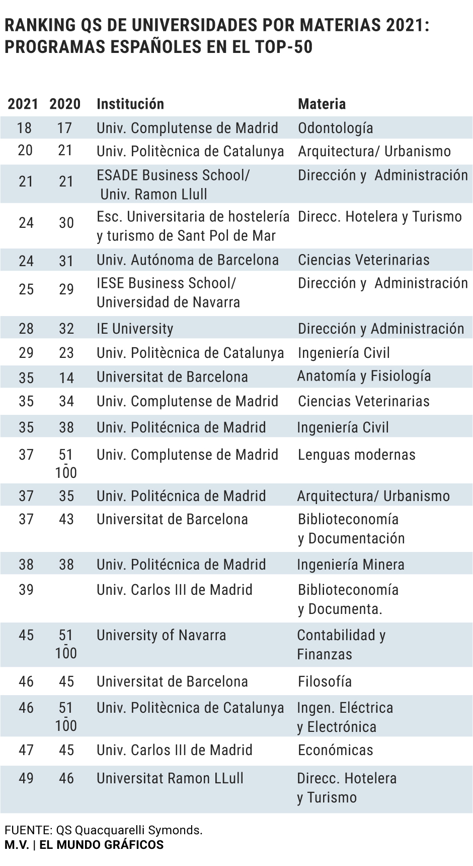 Les universités espagnoles ne se classent pas très haut dans les classements internationaux, mais elles ont tendance à se démarquer beaucoup dans les classifications dans lesquelles elles sont interrogées sur des disciplines spécifiques de la connaissance. C’est le cas de Classement mondial des universités QS par sujet, où vingt-et-un Les programmes d’espagnol font partie des cinquante Meilleur du monde. La liste, qui a été publiée ce jeudi, souligne cependant que les performances des campus espagnols se sont dégradées l’année dernière: 168 des 376 les programmes évalués ont perdu des points dans le classement, alors que seuls 72 ils se sont améliorés.