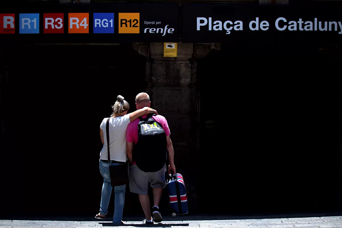 Un couple de touristes britanniques pénètre dans la gare Plaza de Catalua Renfe à Barcelone.