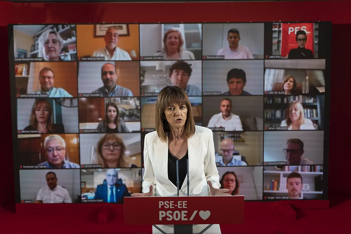 La lder del PSE Idoia Mendia en el acto telemtico acompaada por candidatos al Parlamento Vasco.
