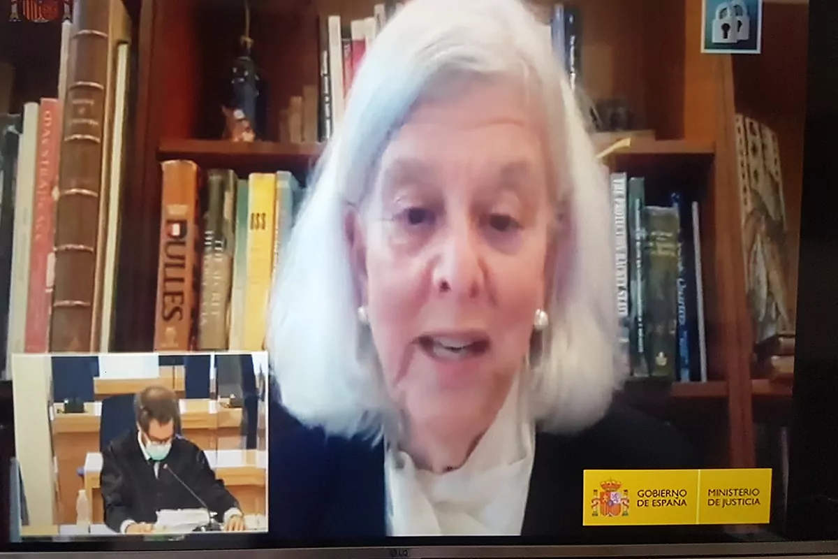 L'expert américain Terry Karl, lors de sa déposition lundi dans le procès qui suit devant le tribunal national pour le meurtre des jésuites espagnols au Salvador en 1989.