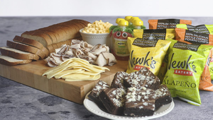 - Essentiels pour le déjeuner en famille (viande et fromage pour le déjeuner, pain, macaroni au fromage, chips de Newk, brownies et sachets de compote de pommes).