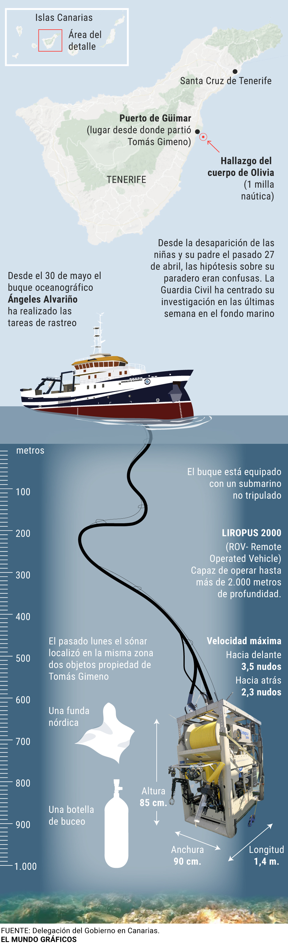 Le corps du mineur se trouvait dans un sac attaché à l’ancre du bateau à moteur. Gimeno, comme le précisent les sources de l’enquête. Il était situé à une profondeur de 1 000 mètres à un mile de la côte de Tenerife. Les tests d’empreintes digitales ont confirmé ce vendredi que le corps retrouvé est celui d’Olivia.