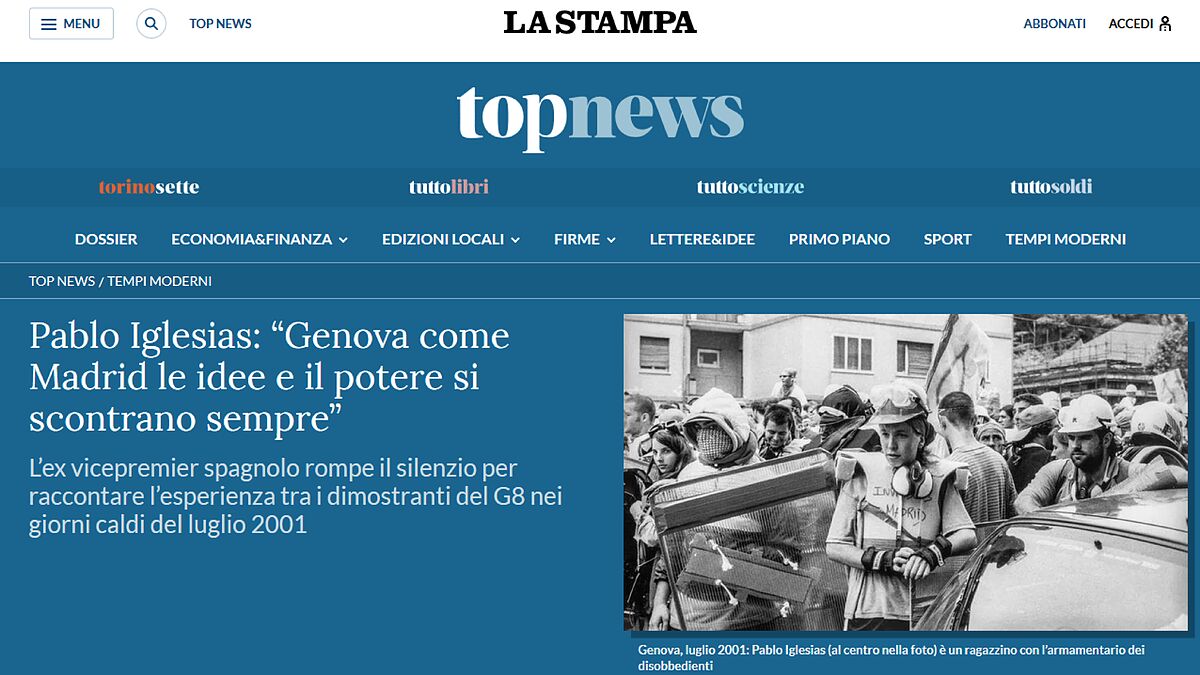 Le journal de Turin illustre l’information avec une photo intacte d’un jeune Pablo Iglesias à l’aube de son activisme politique et vêtu d’un tuta bianca pendant les manifestations. Tute bianche [monos blancos] était le nom que ce mouvement de la gauche politique extra-parlementaire italienne qui a fini par façonner le mouvement Désobéissance, active jusqu’en 2004, comme les manifestant anti-mondialistes les portaient. Iglesias souligne sa relation à l’époque avec Luca Casarini, Nicola Frattoianni Oui Francesco Caruso, les jeunes leaders de Rifondazione, un parti communiste.