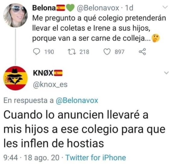 Plus précisément, il s'agit de deux messages diffusés à «large impact», respectivement, depuis le compte @Belonavox et @knox_es: "Je me demande à quelle école Irene et leurs enfants ont l'intention de prendre la queue de cheval, car ils vont être burlesques" et "quand ils l'annonceront emmener mes enfants dans cette école pour qu'ils puissent les faire exploser."
