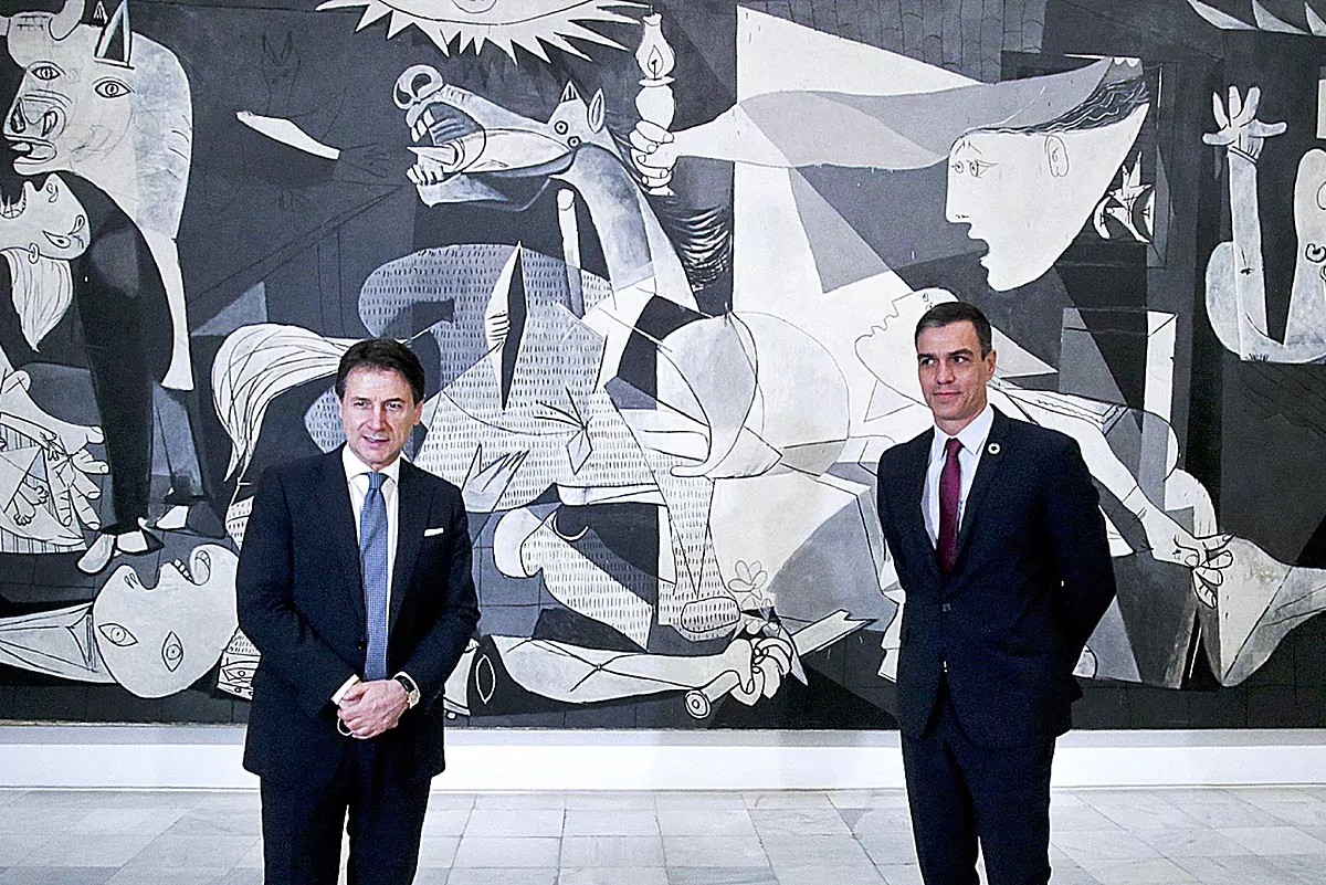 Le Premier ministre, Pedro Snchez, et le Premier ministre italien, Guiseppe Conte, ce mercredi, devant le «Guernica» au Museo Reina Sofa de Madrid.
