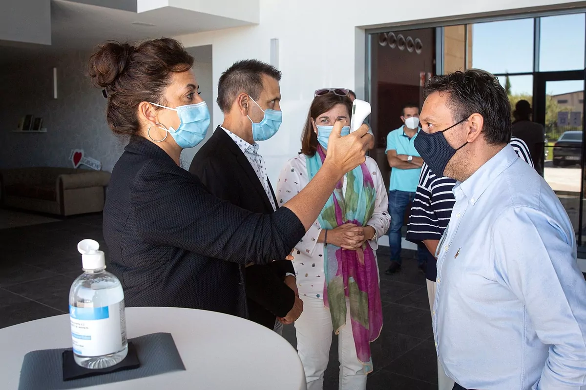 La présidente du gouvernement de La Rioja, Concha Andreu (à gauche), prend la température d'une personne lors d'une visite dans certains établissements vinicoles.
