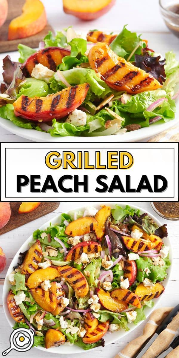 Je n'oublierai jamais le temps où je suis resté avec ma grande tante Mary Lou à New York. En tant que remerciement, j'ai fait ce que je fais de mieux: j'ai cuisiné pour elle! Je lui ai fait une délicieuse salade avec des bleuets, du fromage de chèvre et de la vinaigrette balsamique. Elle n'avait jamais essayé de fruits dans une salade auparavant et était instantanément accrochée! Inspiré par ce doux souvenir, j'ai donné à l'idée une mise à niveau de la saison de pêche. Cette salade de pêche grillée est un showstopper total! Il a des pêches grillées juteuses avec un soupçon de fromage de chèvre crémeux, des amandes croquantes, de l'oignon rouge pointu et de la même vinaigrette balsamique dont ma tante Mary Lou est tombée amoureuse. C'est frais, adapté au budget et complet de surprises.