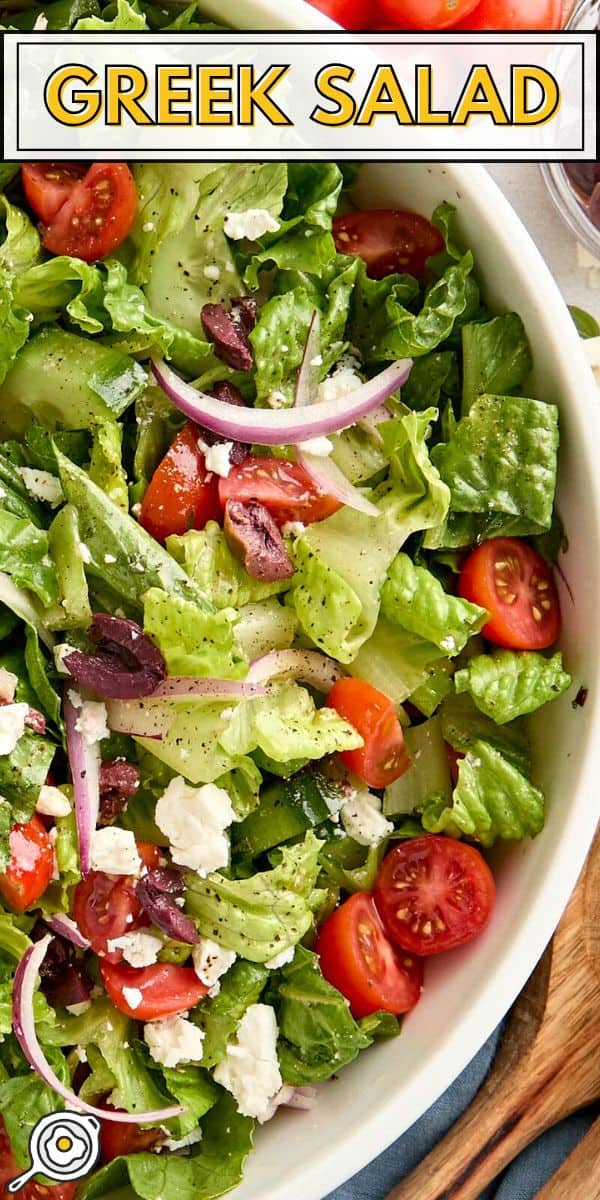 Une salade grecque traditionnelle, également connue sous le nom de Horiatiki ou « salade de village grecque », est préparée avec des ingrédients frais et estivaux que l'on trouve couramment dans la cuisine grecque. Il comprend généralement du fromage feta, des tomates, des concombres, des oignons rouges, des olives et de l'origan, qui est assaisonné d'une simple combinaison d'huile d'olive, d'herbes et parfois de vinaigre (ou de jus de citron). En Grèce, cette salade comprend rarement de la laitue (selon la région), mais dans la variante américaine, de la laitue romaine est souvent ajoutée. Ma recette s'apparente davantage aux salades que l'on trouve dans les restaurants grecs aux États-Unis, car j'adore le croquant et la texture ajoutés de la laitue romaine dans ce plat !
