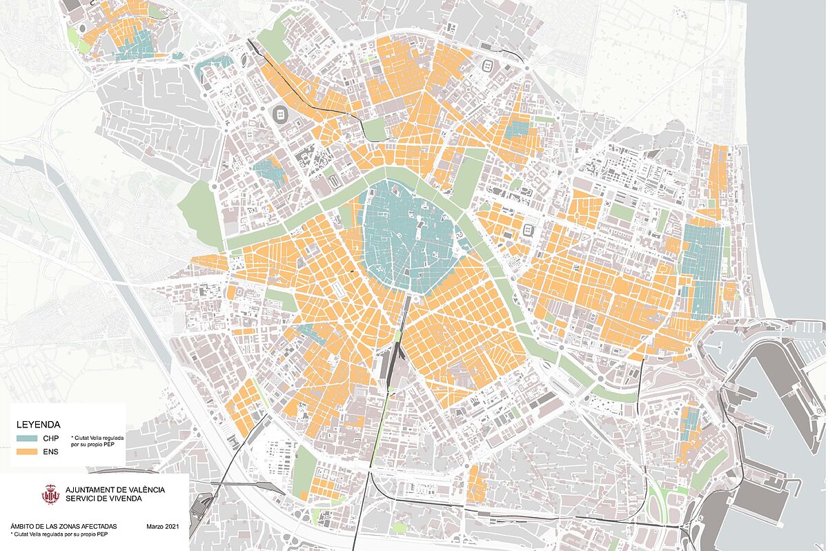 Ainsi, les quartiers concernés sont: Botanic, Arrancapins, Nou Moles, Soternes, la Petxina, La Roqueta, Pla del Remei, Russafa, Gran Va, Mont-Olivet, En Corts, Na Rovella, la Fonteta Sant Llus, Patraix, la Raiosa , Croix couverte, partie de San Marcel * l, Amistat, Albors, Cam Fondo, Creu del Grau, Ayora, partie de Grau, Vega Baja, partie de Malvarrosa et Mestalla, Exposicin, une bonne partie de Benicalap, Benimmet et Benimaclet, San Isidro, Orriols, Torrefiel, une bonne partie de San Antonio, Tormos, Marxalenes et Tendetes.