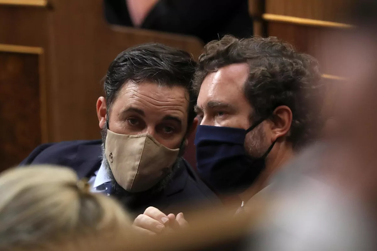 Santiago Abascal et Ivn Espinosa de los Monteros, respectivement leader et porte-parole du groupe parlementaire Vox, ce mardi au Congrès.